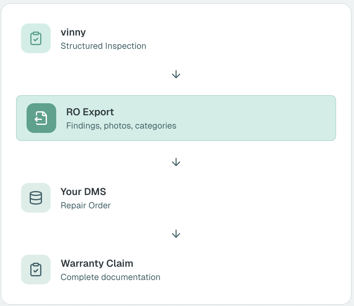 vinny sits upstream at the inspection. We capture structured findings before the RO is created and generate structured RO export files — findings, photos, categories, and documentation organized and ready to transfer. We're working toward native DMS integrations and auto-mapped OEM repair codes to make that handoff even faster.